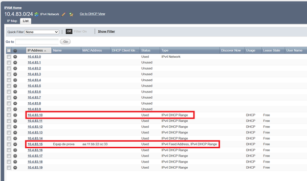 A més a més, a la vista IPAM de la xarxa, podrem veure en quin estat està cadascuna de les IPs de la nostra xarxa. A la imatge estan enquadrats els 2 tipus que hem vist fins ara: