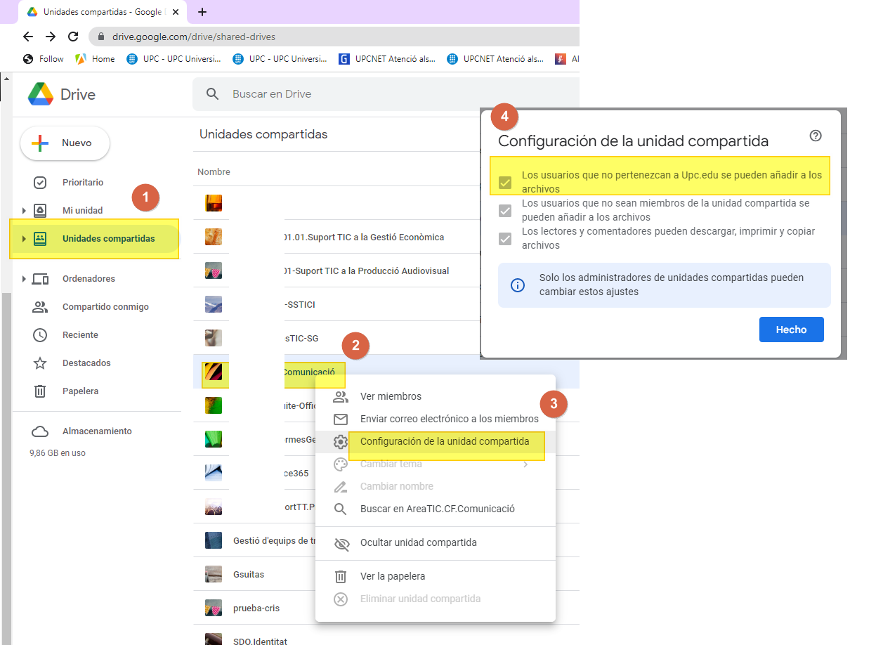 - Per defecte no tenim permisos per compartir fora de la UPC, si ens calen, seguirem el procediment per demanar permisos per compartir fora de la UPC