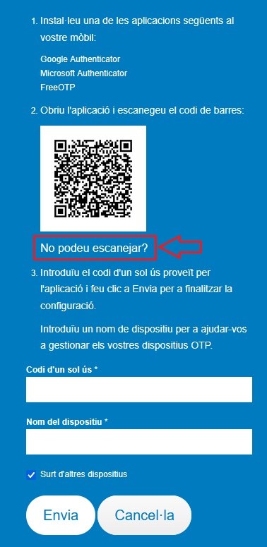 Un cop hi accedeixis, podràs visualitzar i copiar el codi "Secret Key" clicant sobre l’opció No podeu escanejar?