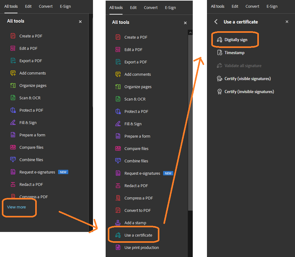 2- Obre el document que vulguis signar i fes click a l'apartat d'eines i sel·lecciona al final del llistat l'opció "Ver más" o "View more" i aquí Certificats > Signar digitalment: