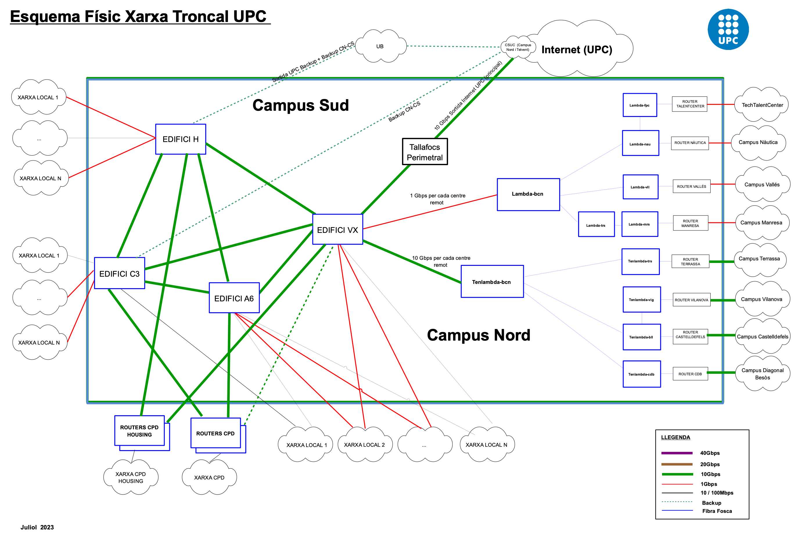 Els diferents campus de la UPC situats a Barcelona, estan interconnectats a través dels routers de l'edifici H, l'edifici C3, l'edifici A6 i el router de l'edifici Vèrtex amb connexions GigabitEthernet (1Gbps).