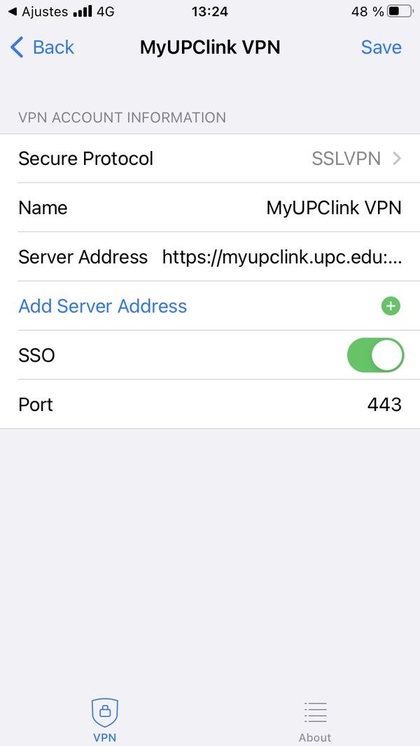 Configura la VPN amb les dades següents:
