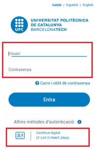 - En el cas de ser membre de la comunitat UPC, es pot accedir amb les credencials UPC o bé amb certificat digital.